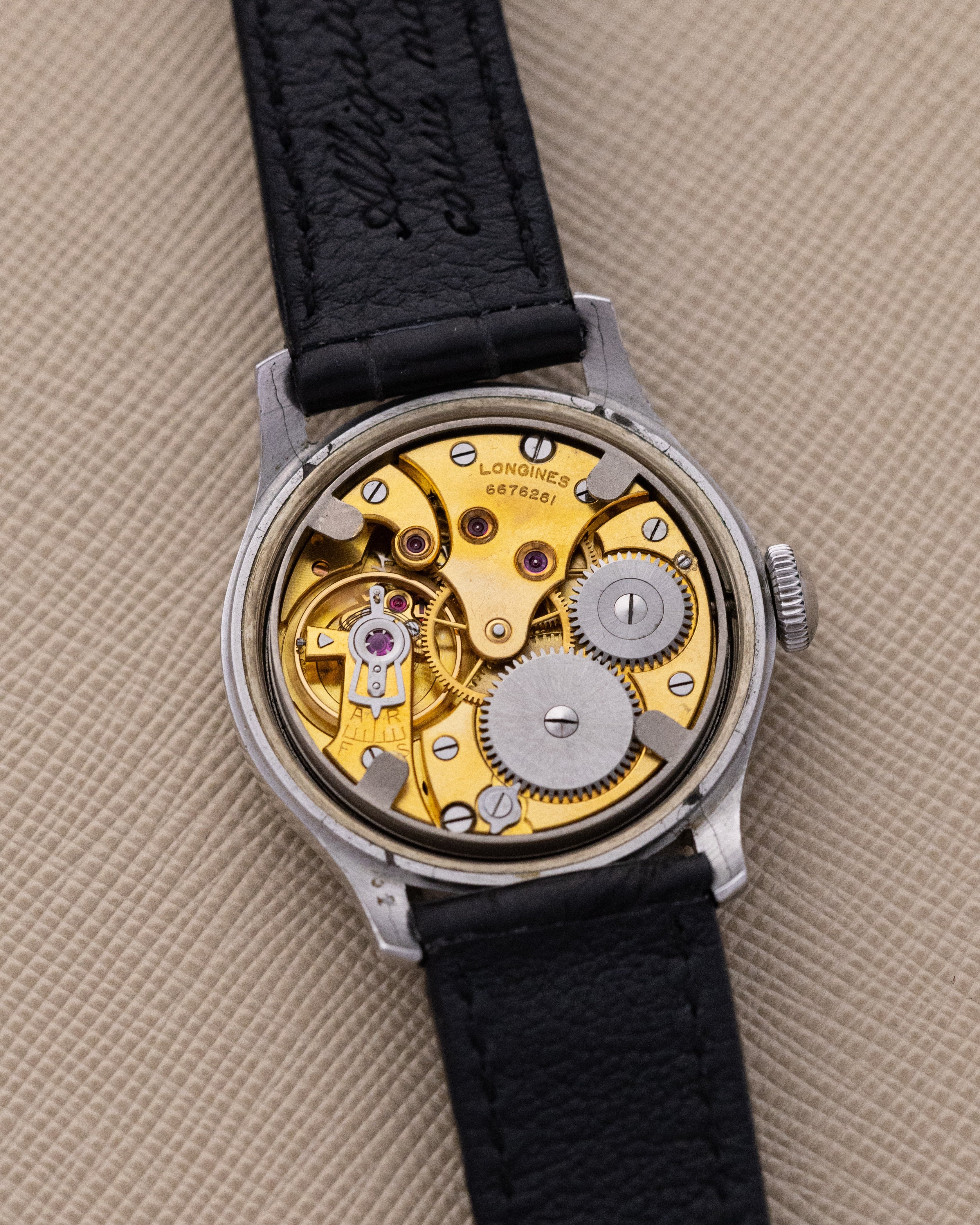 Inside is the Longines Caliber 12.68Z, a hand-wound movement regarded as one of the brand’s most respected calibers. It was widely used by Longines during the 1930s and 1940s. The serial number 6676281 dates this watch to 1943, placing it firmly within Longines’ wartime production years. The watch is offered with two straps, allowing for easy versatility in wear. Overall, this is a strong and honest example of a highly sought-after Longines bullseye from the golden age of mechanical watchmaking.