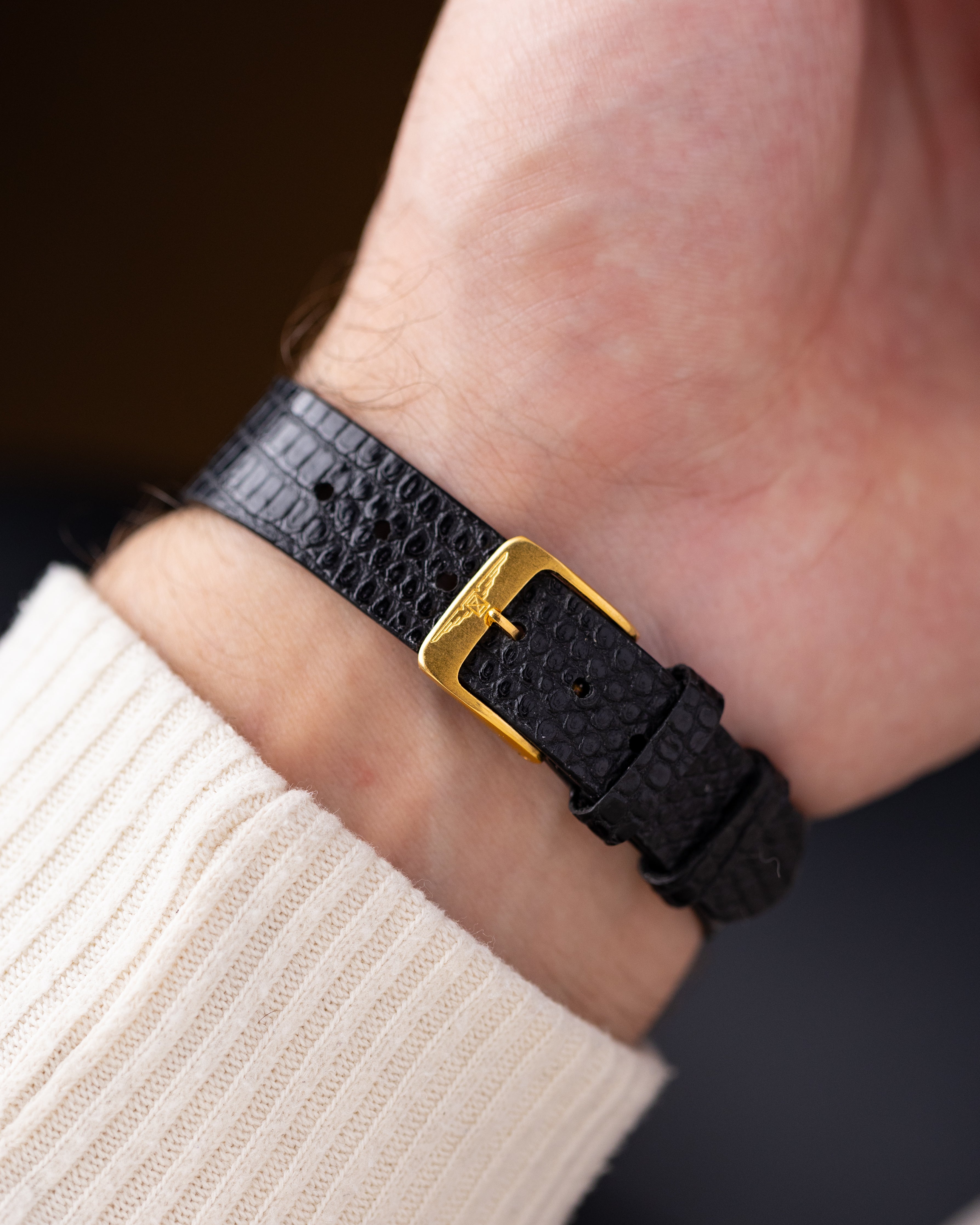 The 31 x 31 mm gold-plated case has a soft cushion shape, giving it a dressy presence without being flashy. At only 6 mm thick, it slides easily under a cuff and wears comfortably on a variety of wrist sizes. The 36.3 mm lug-to-lug length keeps the profile balanced and refined.
