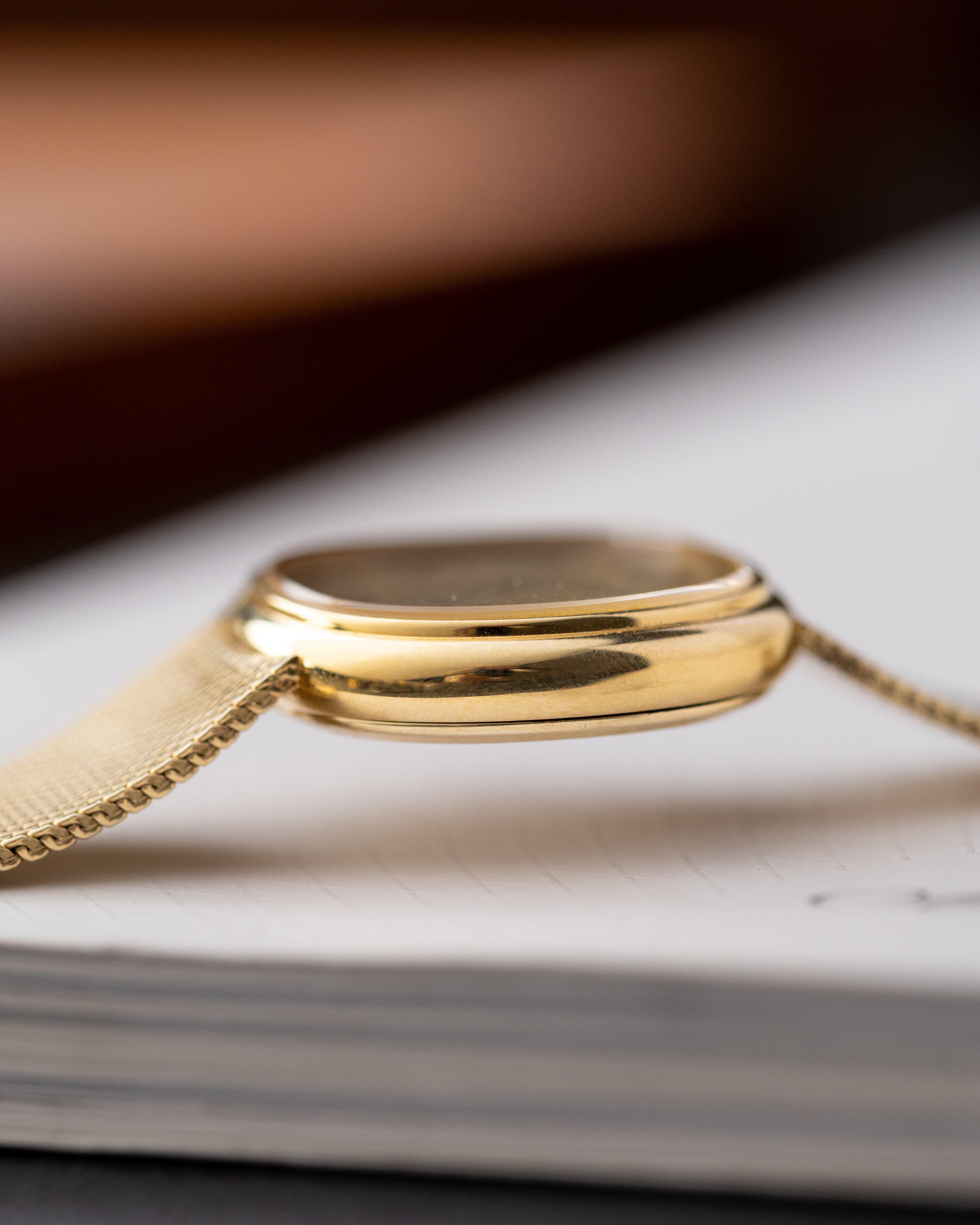 Measuring 33.2mm x 31mm and just 8mm thick, it wears light and refined on the wrist — ideal for dress occasions or everyday minimalist style. The champagne dial features a simple layout with stick markers and hands, letting the case shape and warm dial tone do all the talking.