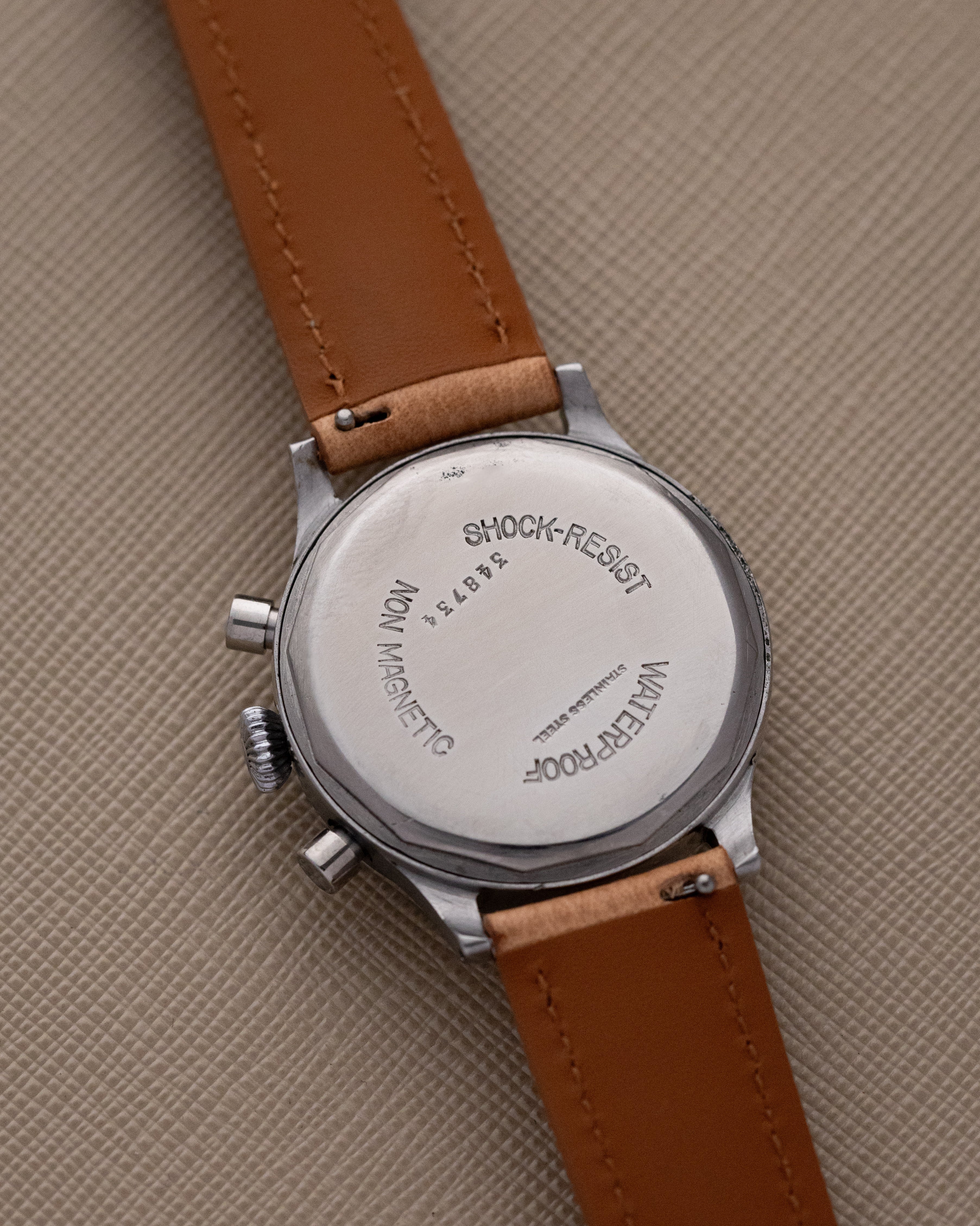 Powered by the reliable Landeron 48 movement, the chronograph operates a bit differently than typical chronographs: the top pusher starts the timer, the bottom pusher stops it, and a second press of the bottom pusher resets the hand to zero. With a case thickness of 13.4 mm and lug-to-lug span of 41.3 mm, this watch wears with timeless vintage proportions and bold presence. A rare and mechanically sound timepiece for any serious chronograph enthusiast.