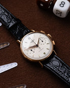 This vintage Universal Genève Uni-Compax is one of those watches that instantly explains why collectors are obsessed with these chronographs. The two-register layout is perfectly balanced, the dial has aged beautifully into a warm cream tone. Classic dauphine hands and recessed sub-dials give it that unmistakable vintage depth, and the “Uni-Compax” signature seals the deal.