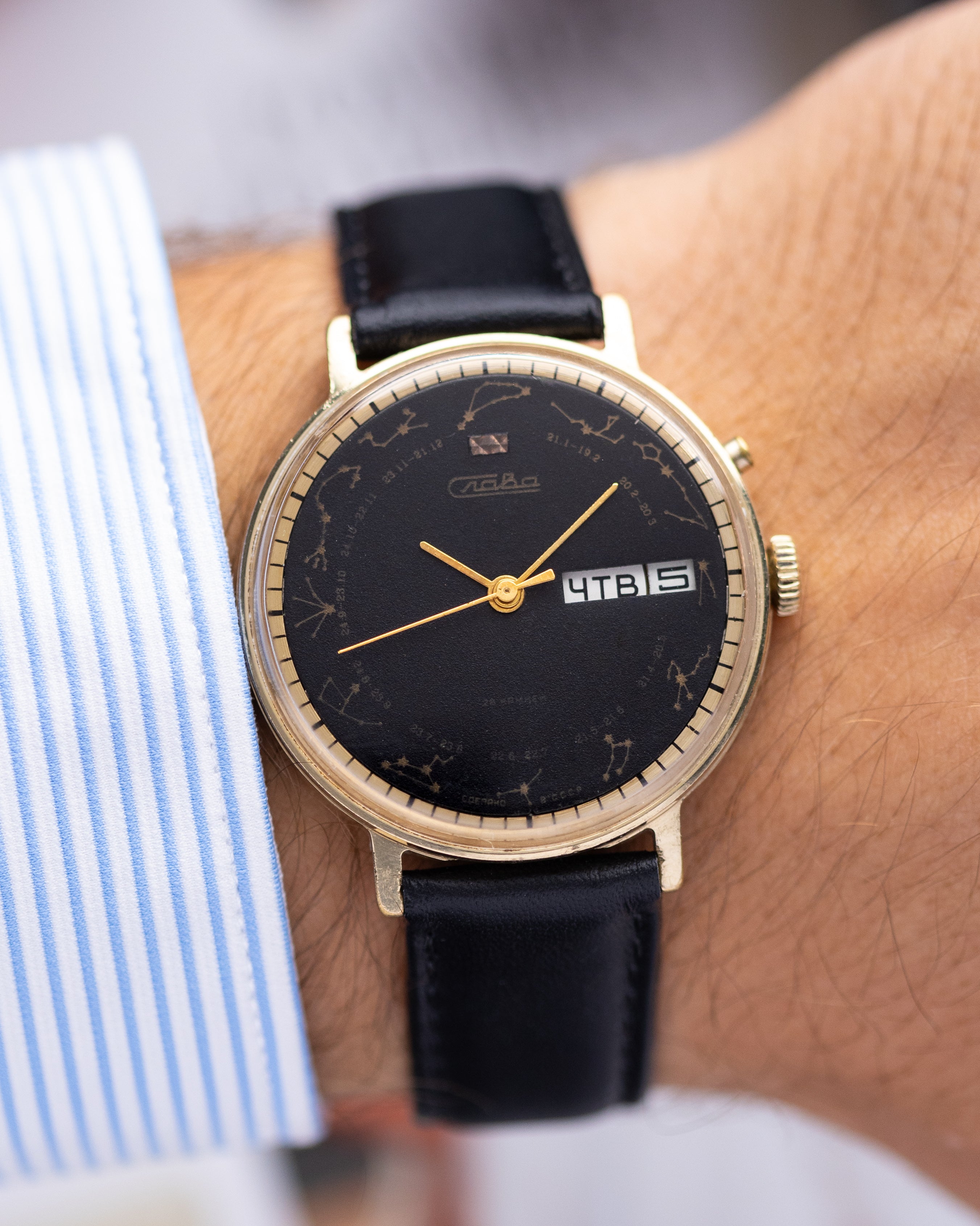 This rare Slava Zodiac Signs wristwatch from the USSR features the caliber 2428 movement with 28 jewels, making it a standout timepiece from the Soviet era. The black dial is adorned with subtle zodiac constellation graphics around the edge, giving it a unique and celestial appearance. The gold-tone case and matching hands add a touch of elegance, while the day-date complication offers practicality.