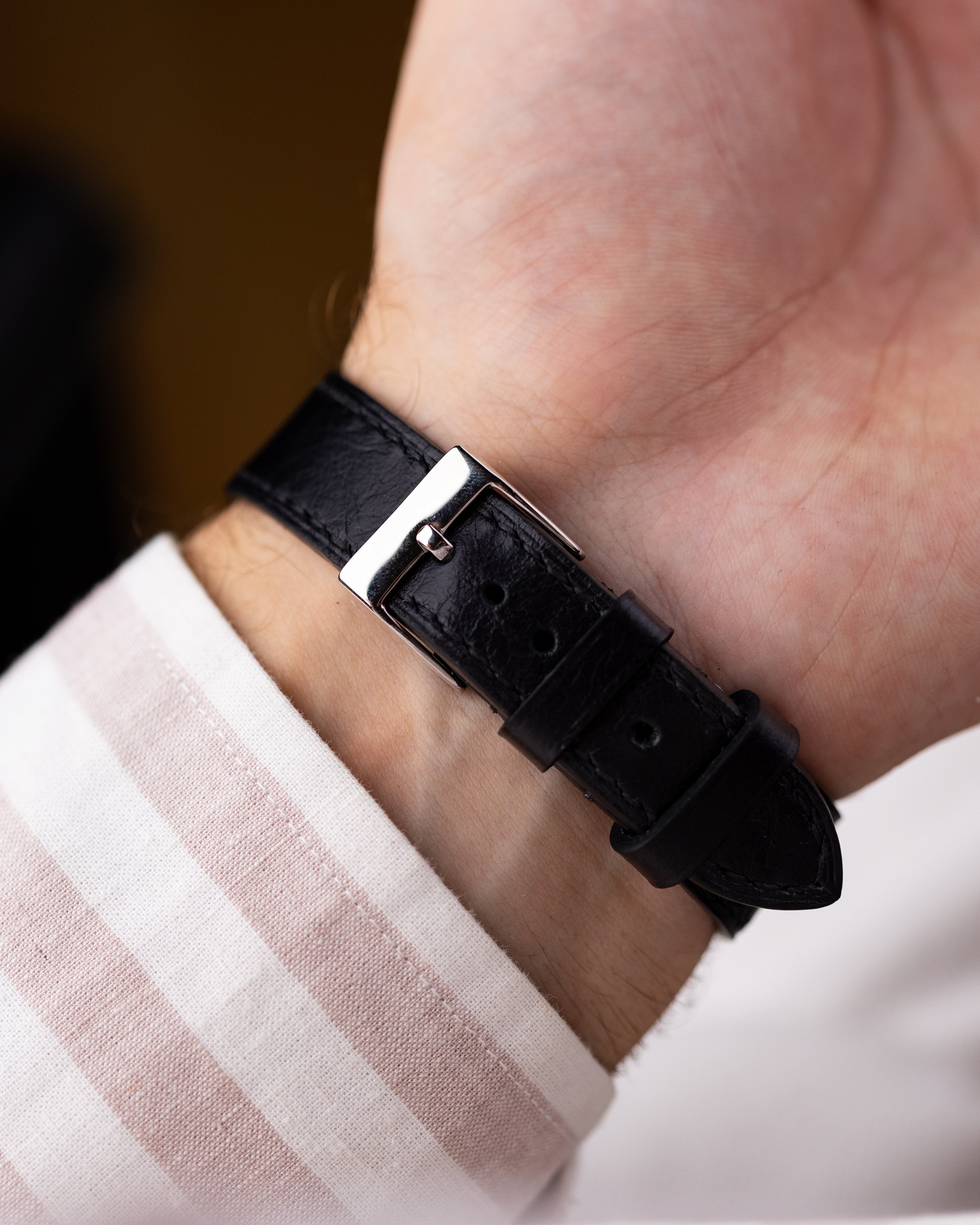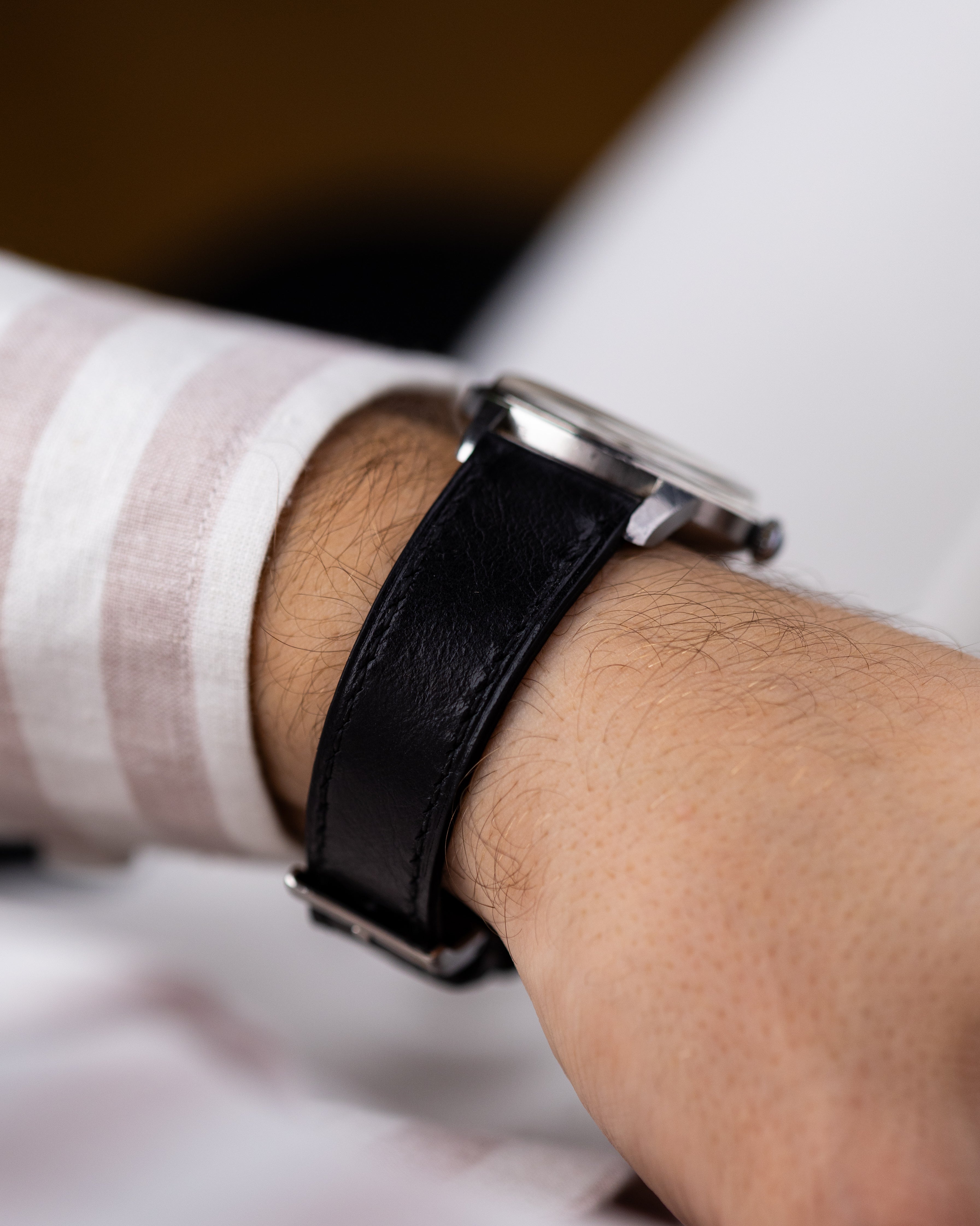 The 35mm stainless steel case features long, tapered lugs and a slim profile, measuring 43mm from lug to lug. It wears elegantly on the wrist while offering subtle wrist presence. Inside is Zenith’s bumper automatic movement — a transitional mechanism that offers a distinctive tactile feel and historical importance.