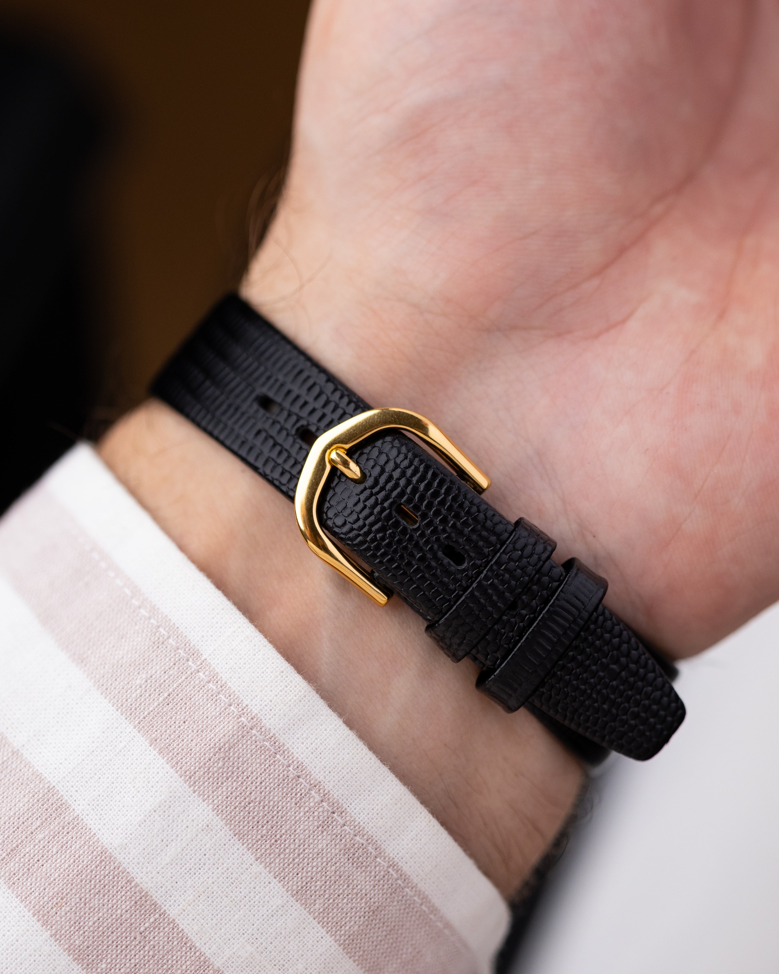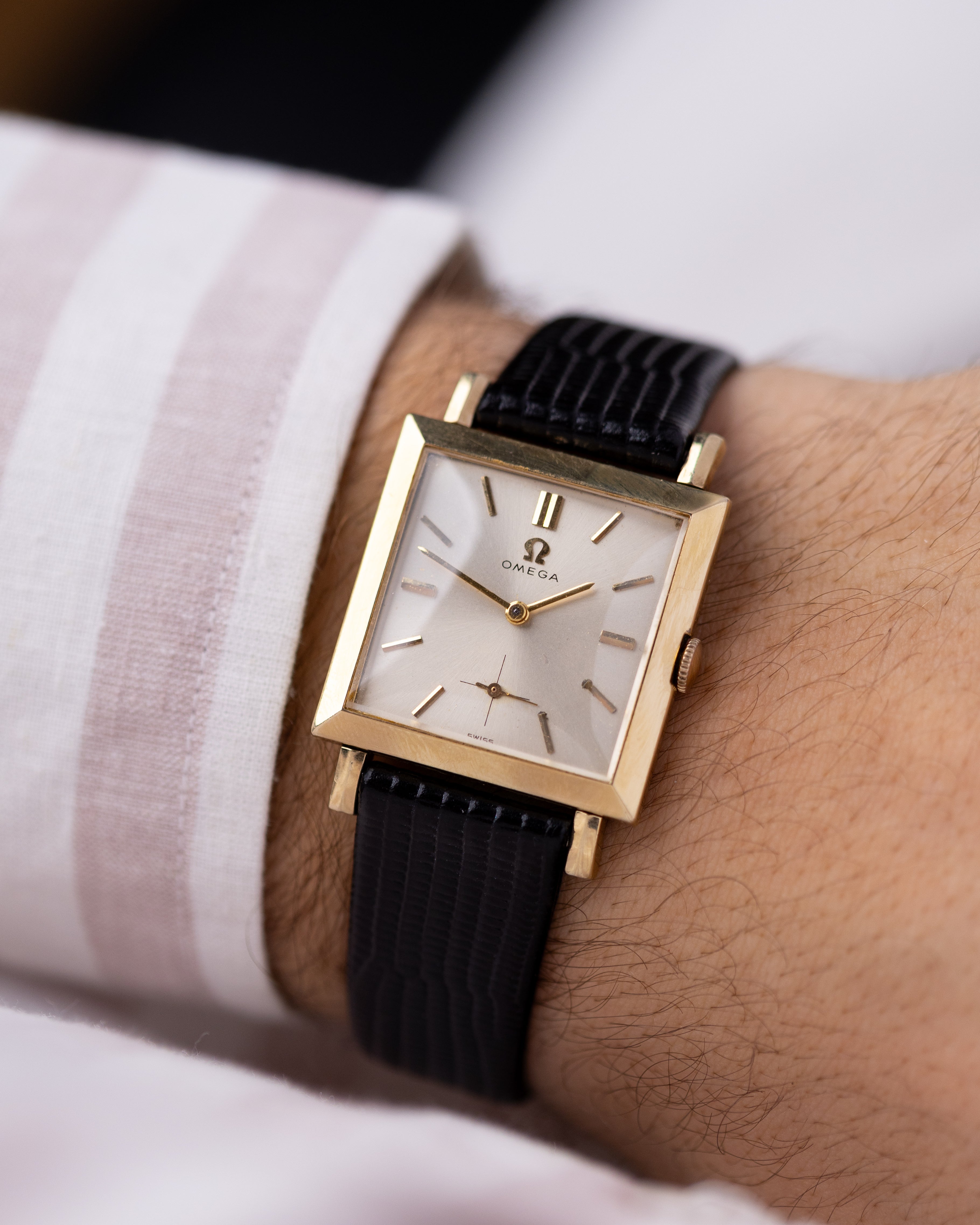 The watch features a 28mm x 38mm rectangular case with crisp facets and integrated lugs, giving it a sharp and refined silhouette on the wrist. At just 8mm thick, it wears low and comfortably while still making a confident vintage statement.