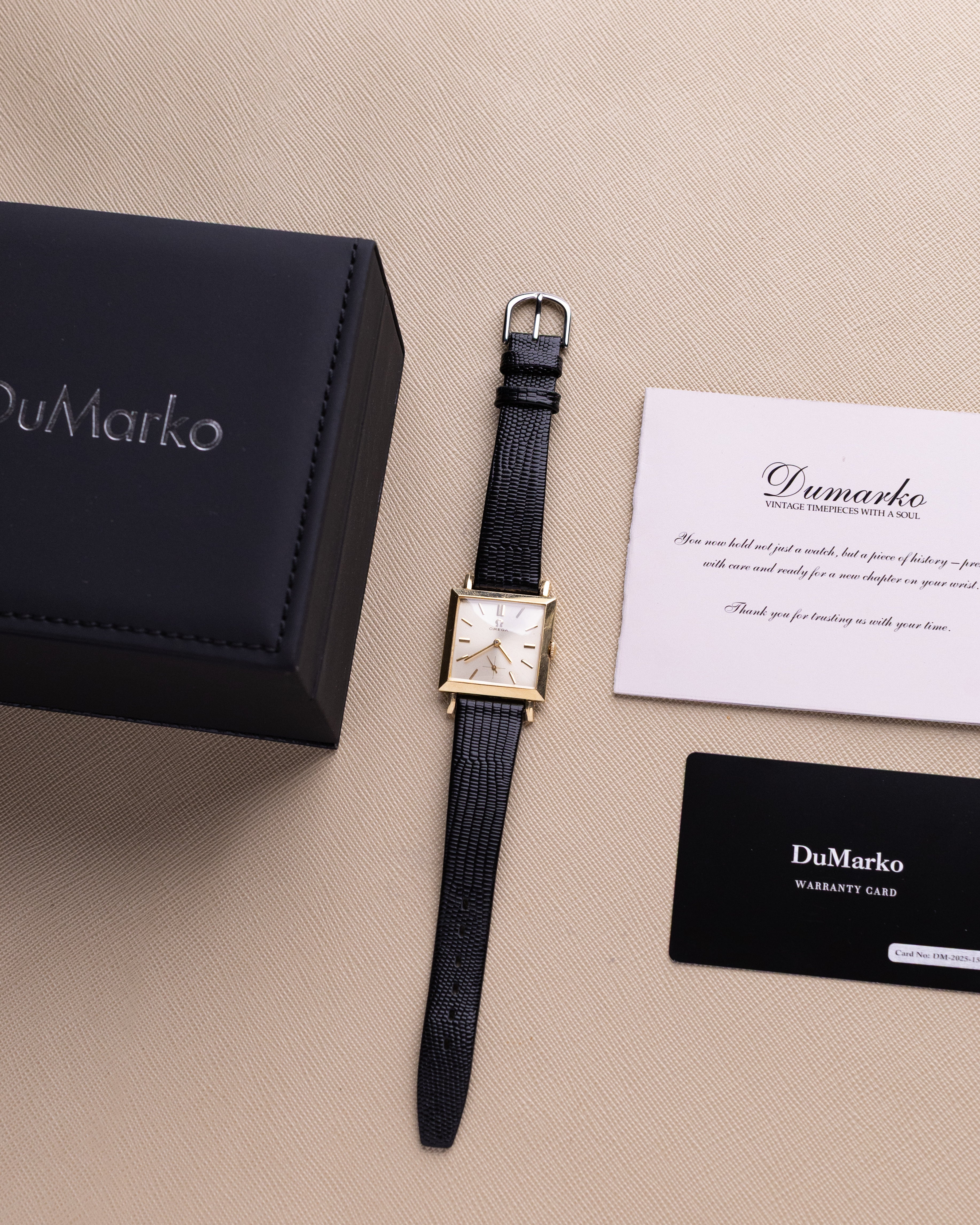 This 1957 Omega Art Deco Tank is a stunning example of mid-century elegance, powered by the manual wind Caliber 302 and housed in a warm gold-filled rectangular case. With its slim profile and architectural lines, this piece channels the understated sophistication of 1950s Omega design.