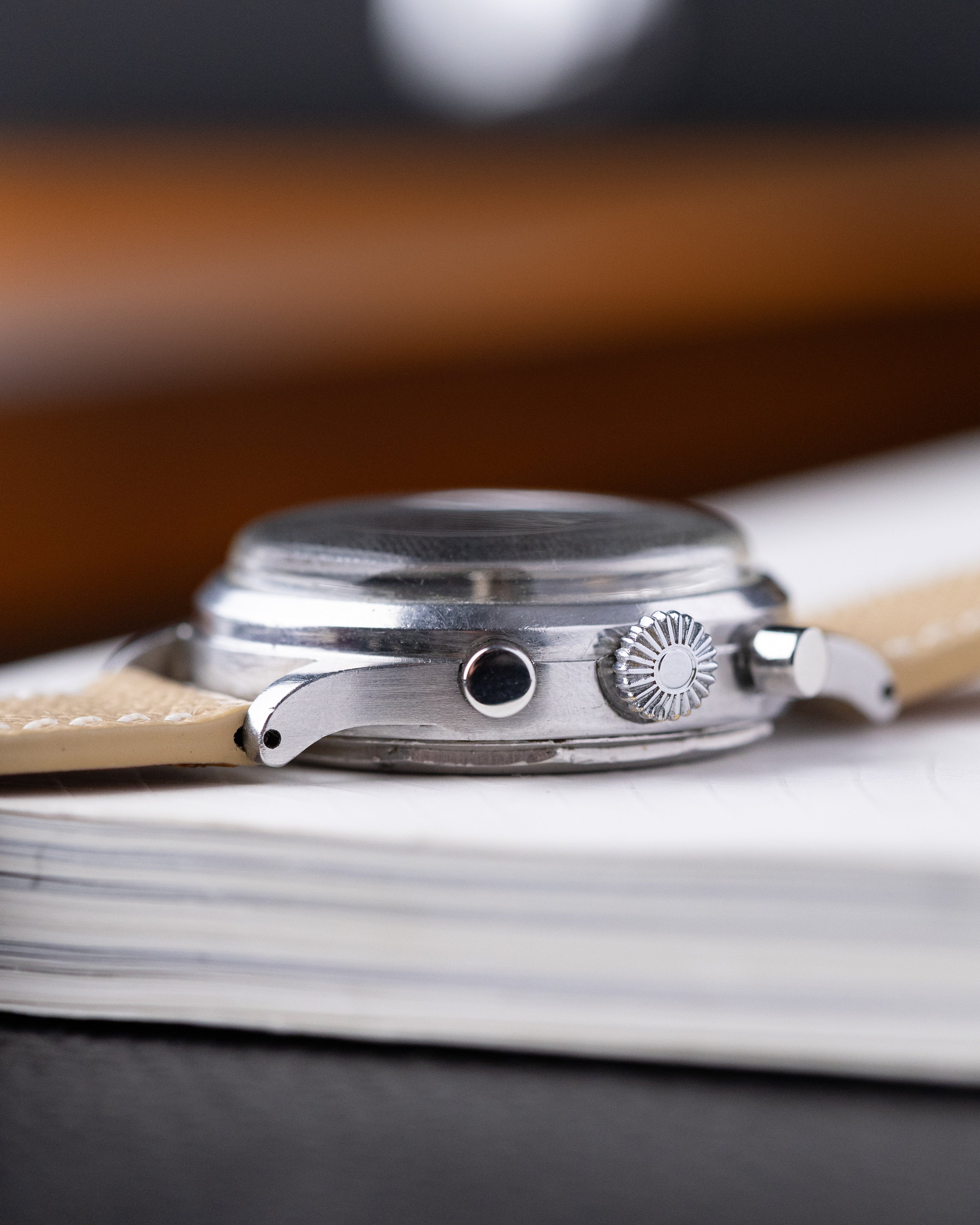 Powered by the reliable Landeron 48 movement, the chronograph operates a bit differently than typical chronographs: the top pusher starts the timer, the bottom pusher stops it, and a second press of the bottom pusher resets the hand to zero. With a case thickness of 13.4 mm and lug-to-lug span of 41.3 mm, this watch wears with timeless vintage proportions and bold presence. A rare and mechanically sound timepiece for any serious chronograph enthusiast.