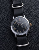 With its large 40.5 mm case and rare three-pusher chronograph layout — including a reset pusher cleverly integrated into the crown — this piece is a serious collectible for connoisseurs of military timepieces and early chronograph engineering.
