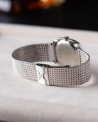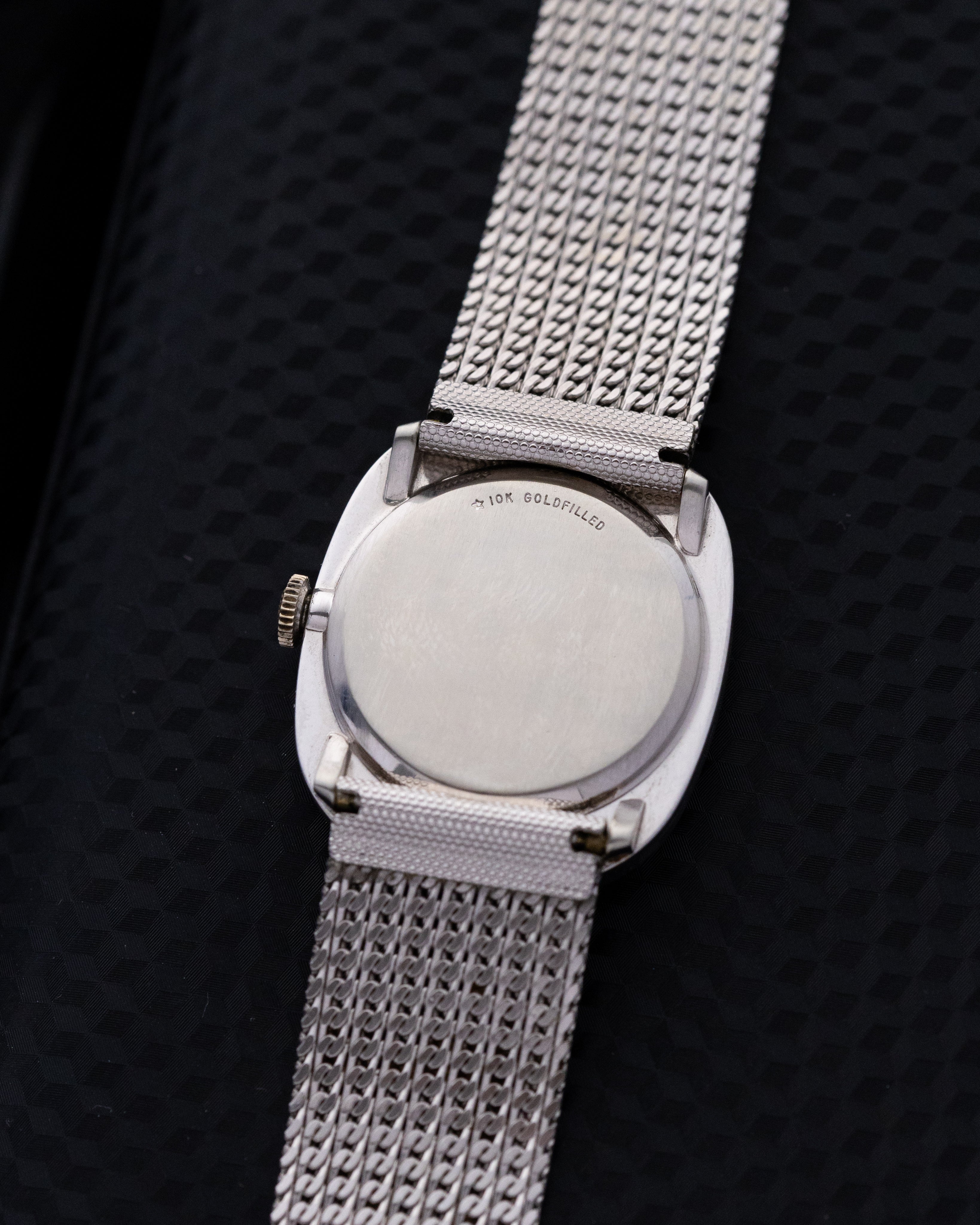 The 10K white gold-filled case gives the watch a bright, understated presence that works equally well for formal wear or everyday use. Measuring 27mm by 32mm with a slim 7.3mm profile, it wears comfortably on the wrist and slips easily under a cuff. The elliptical case shape adds character without feeling oversized or flashy.