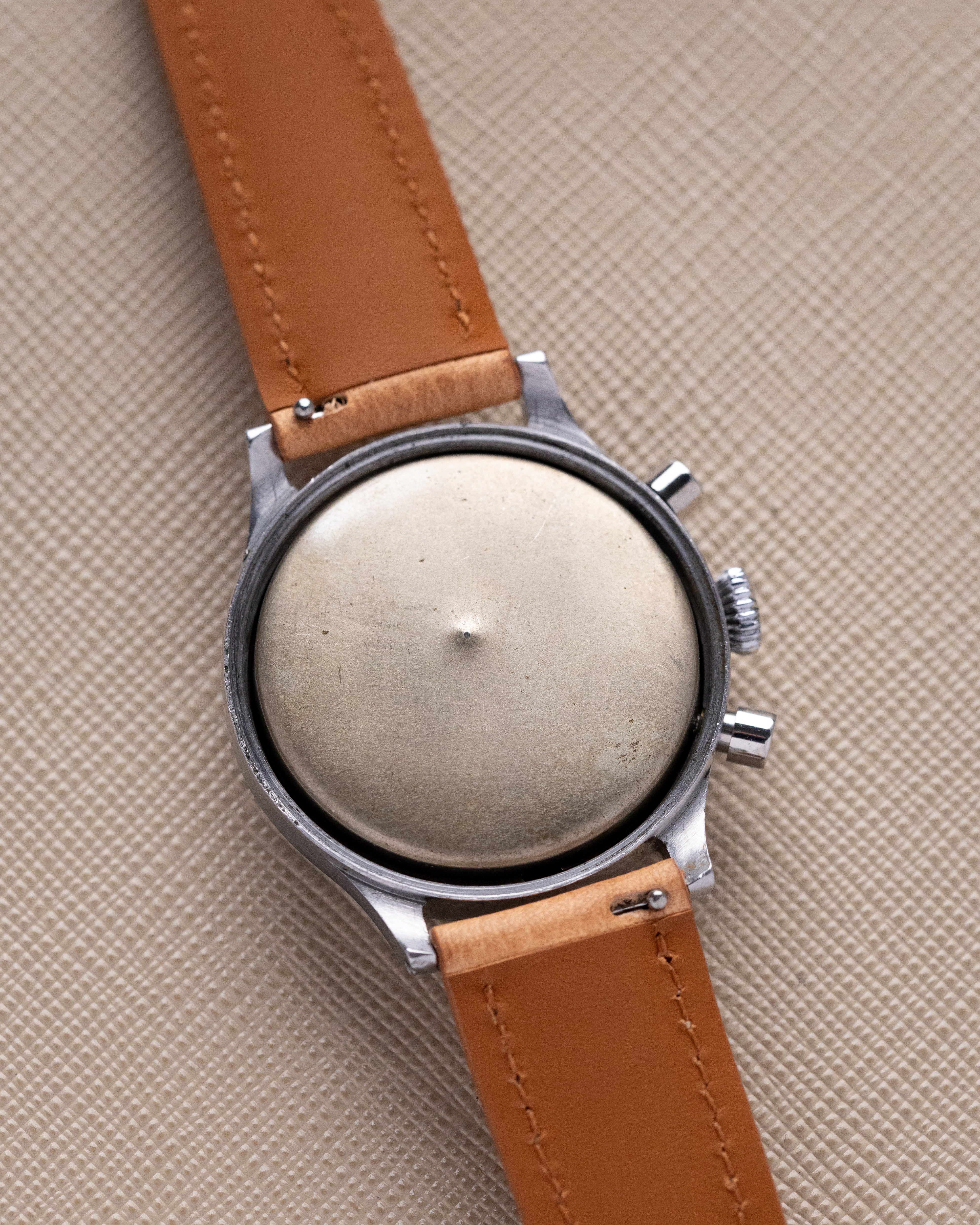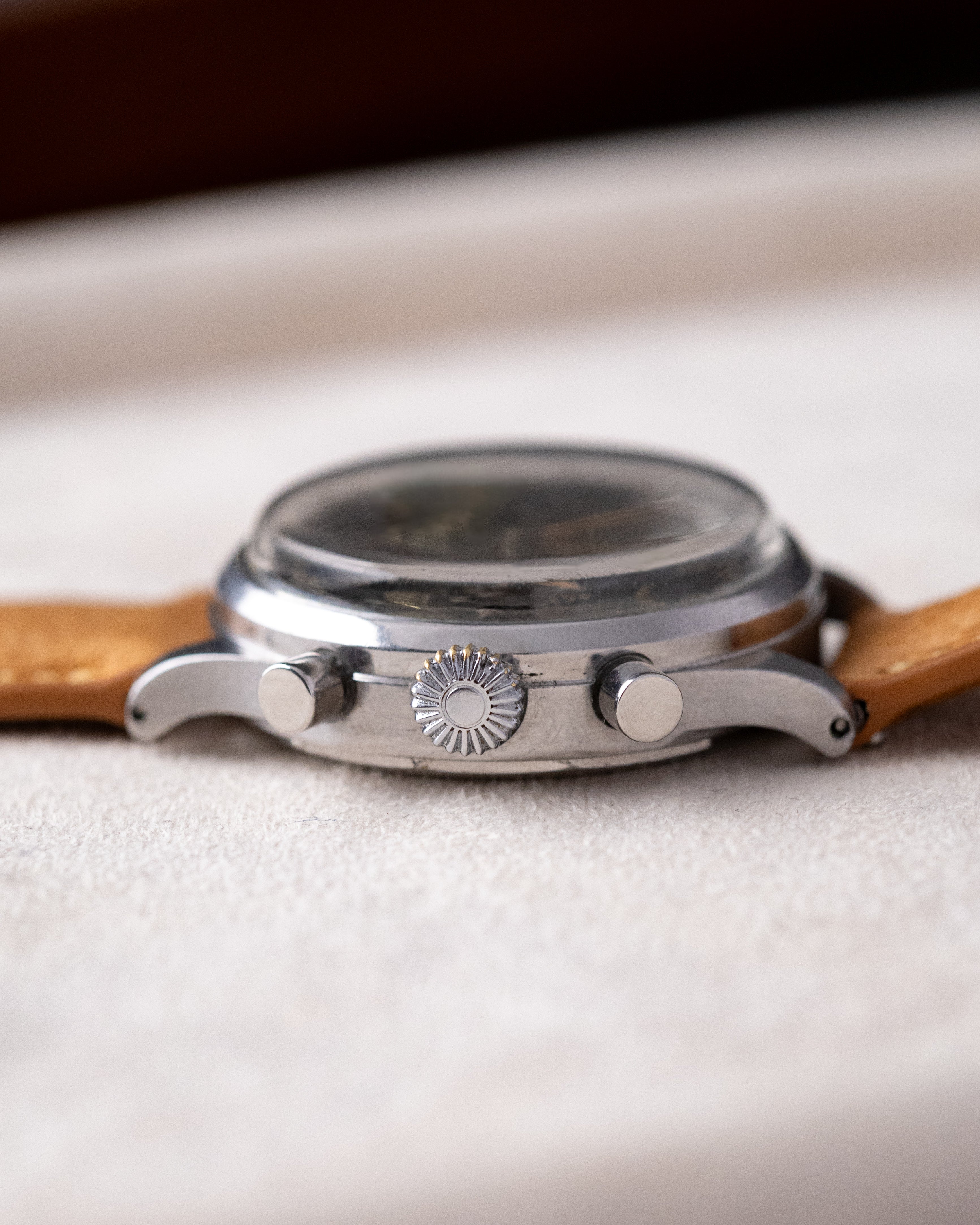 Powered by the reliable Landeron 48 movement, the chronograph operates a bit differently than typical chronographs: the top pusher starts the timer, the bottom pusher stops it, and a second press of the bottom pusher resets the hand to zero. With a case thickness of 13.4 mm and lug-to-lug span of 41.3 mm, this watch wears with timeless vintage proportions and bold presence. A rare and mechanically sound timepiece for any serious chronograph enthusiast.
