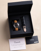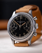 This vintage Baume & Mercier Genève chronograph is a stunning and rare example - what sets this piece apart is its original black dial - a seldom-seen feature that adds to its desirability among collectors. The dial features a dual-register chronograph layout, luminous Arabic numerals, and a classic tachymeter scale around the periphery, all highlighted by warm patina and syringe-style hands.