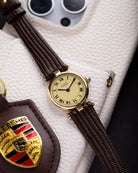 The dial is the heart of this piece. Cream-champagne in color, it is laid out with bold black Roman numerals and a delicate railroad minute track. Powering it all is the Swiss-made Cartier Caliber 90.06 quartz movement - reliable, accurate, and built to Cartier's own standards. This is a vintage swiss quartz watch that simply works.