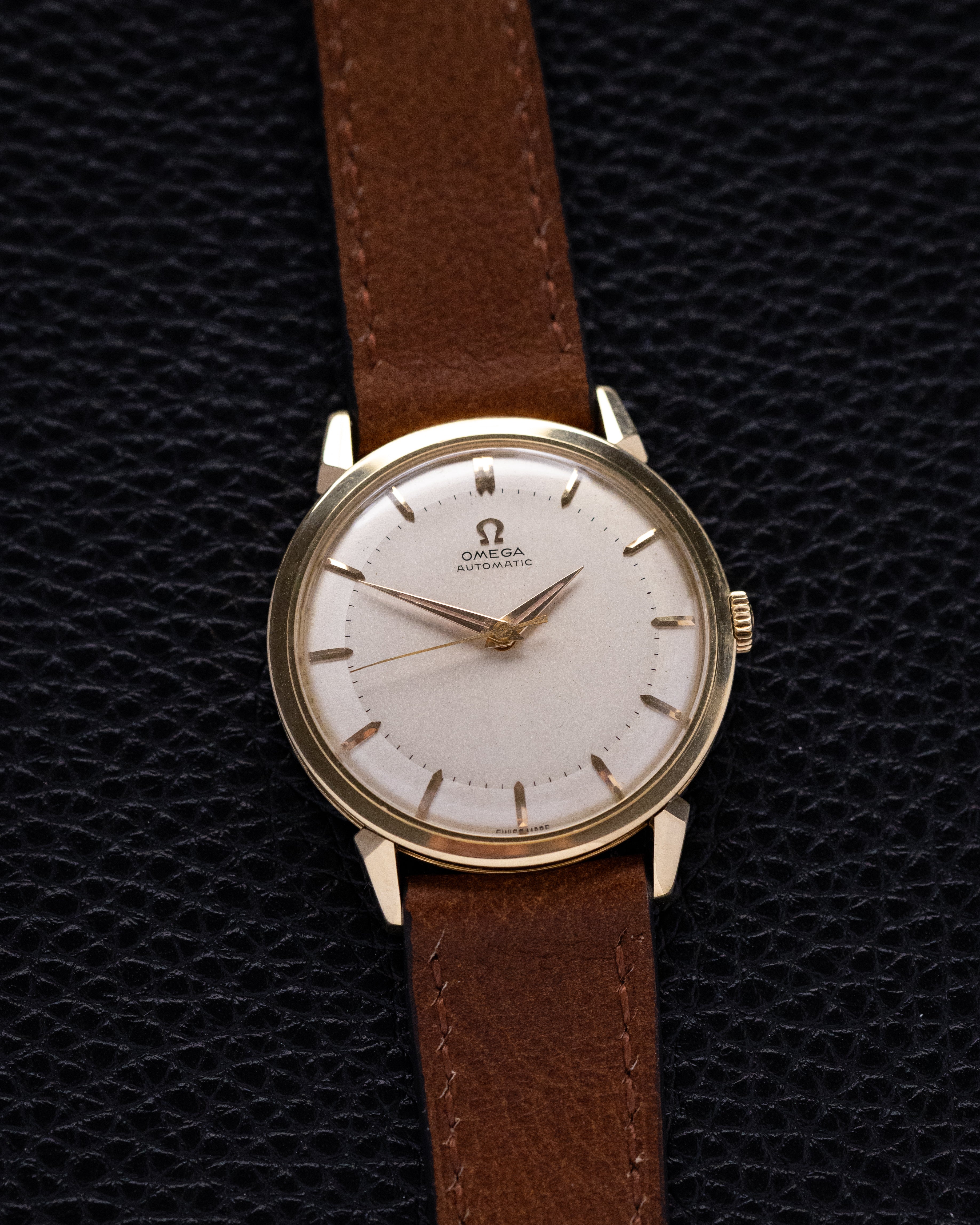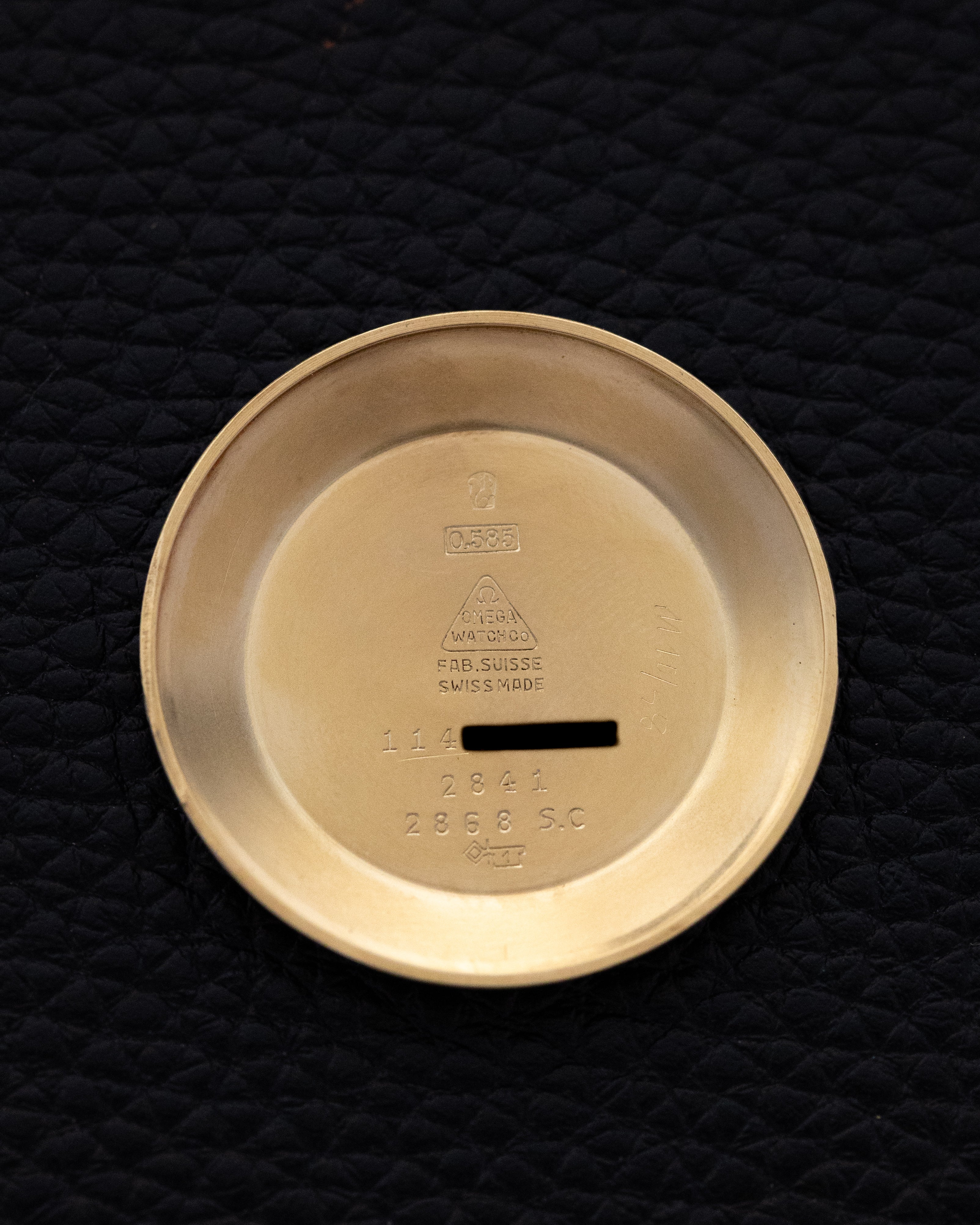 This vintage Omega reference 2841/2868 SC is a grea example of mid-1950s Omega design, where form and proportion were carefully considered but never overstated. The solid 14K gold case is defined by its “crab lug” construction, with sharply faceted lugs that extend outward and slightly down, giving the watch a more sculptural presence on the wrist.