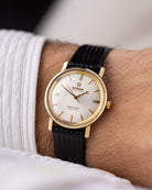 This vintage Omega Seamaster De Ville from 1966 offers the kind of understated elegance that made the De Ville line a favorite throughout the 1960s. With its slim gold case, clean dial design, and compact proportions, it delivers that classic Omega look that remains timeless today. The reference B 6320 is especially charming thanks to its smaller 31.5mm case, which wears beautifully thanks to long, graceful lugs that extend to 37mm and give the watch an airy, balanced silhouette.