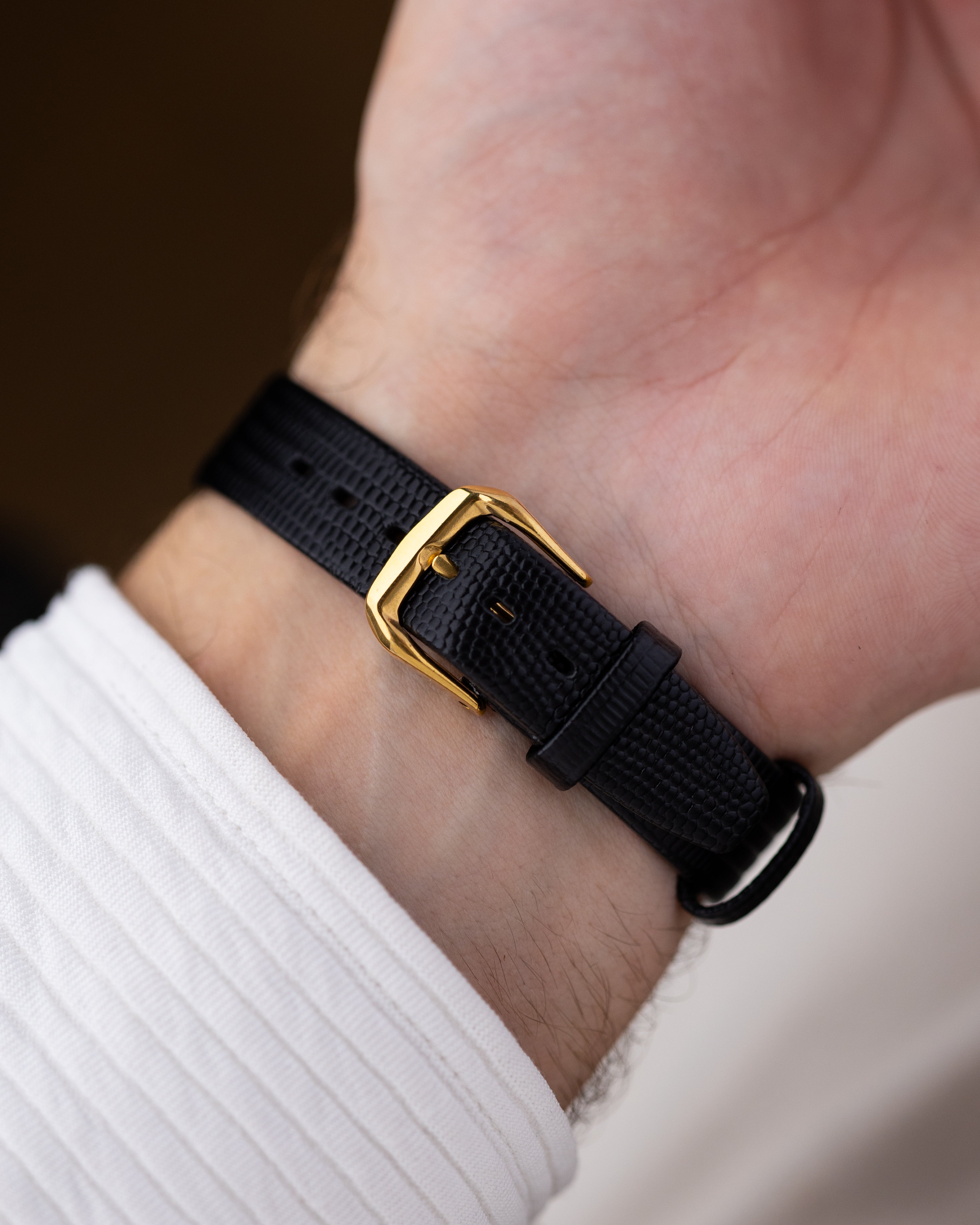 The dial is crisp and bright, with a soft sunburst finish that plays gently with the light. Applied gold indices and matching baton hands create a refined, minimalist layout, while the classic “Seamaster De Ville” script adds the right touch of mid-century charm. The gold Omega logo sits proudly at 12 o’clock, matching the applied “Omega Automatic” text. Together, these elements give the dial a calm, confident presence that feels both vintage and enduringly stylish.