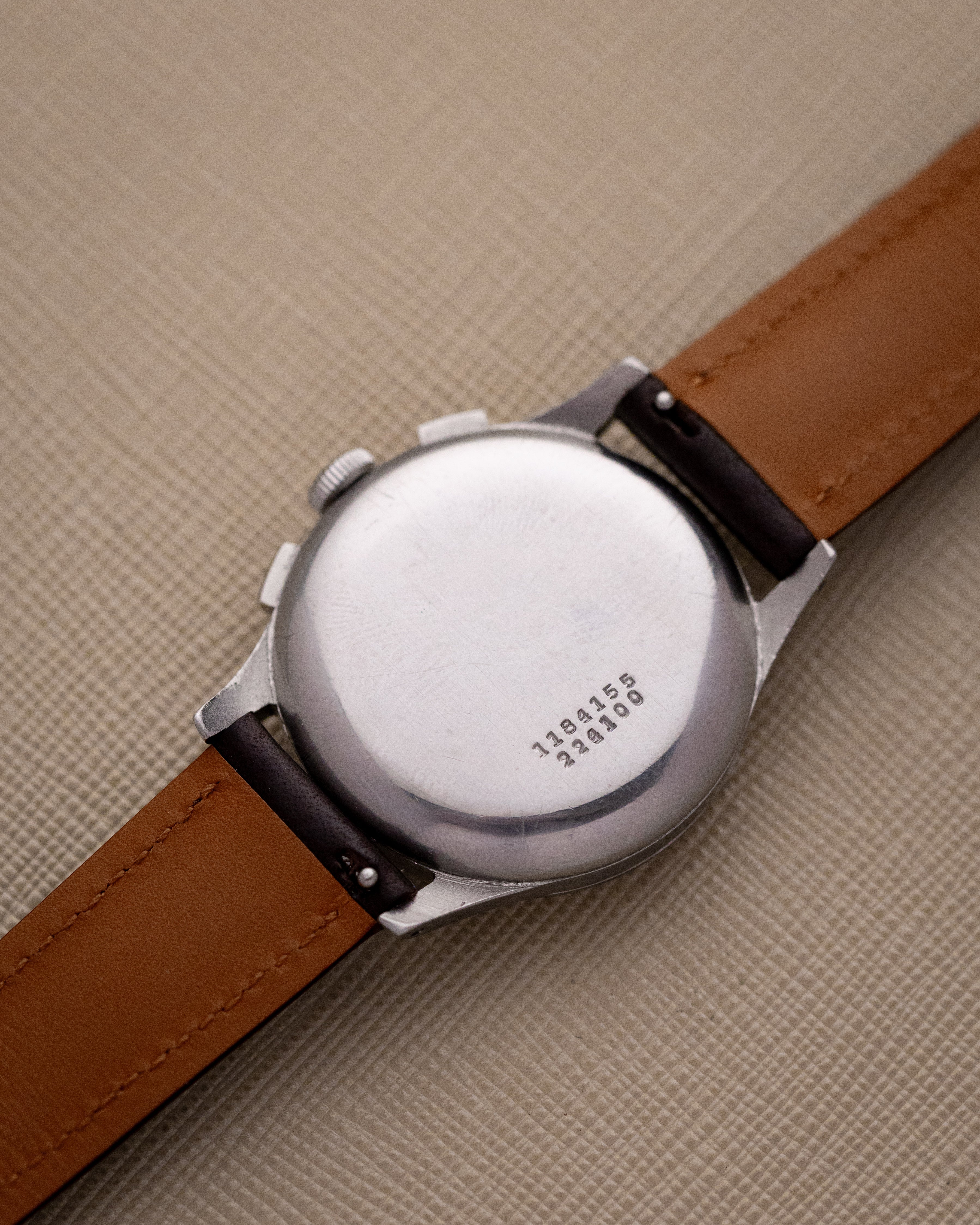 The dial features original radium lume-filled Arabic numerals and markers — a detail that collectors value highly for authenticity. Stainless steel Compax models with luminous dials were intended as practical instruments in their era, in contrast to gold-cased, non-luminous versions that leaned more toward formal wear. This example stays true to its purposeful origins.