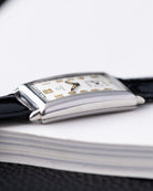 The professionally restored white rectangular dial is adorned with elegant gold and black Arabic numerals, paired with black hands for excellent readability. The case measures 22 mm in width and 39 mm in height, offering a sleek, sophisticated profile ideal for collectors and vintage watch enthusiasts.