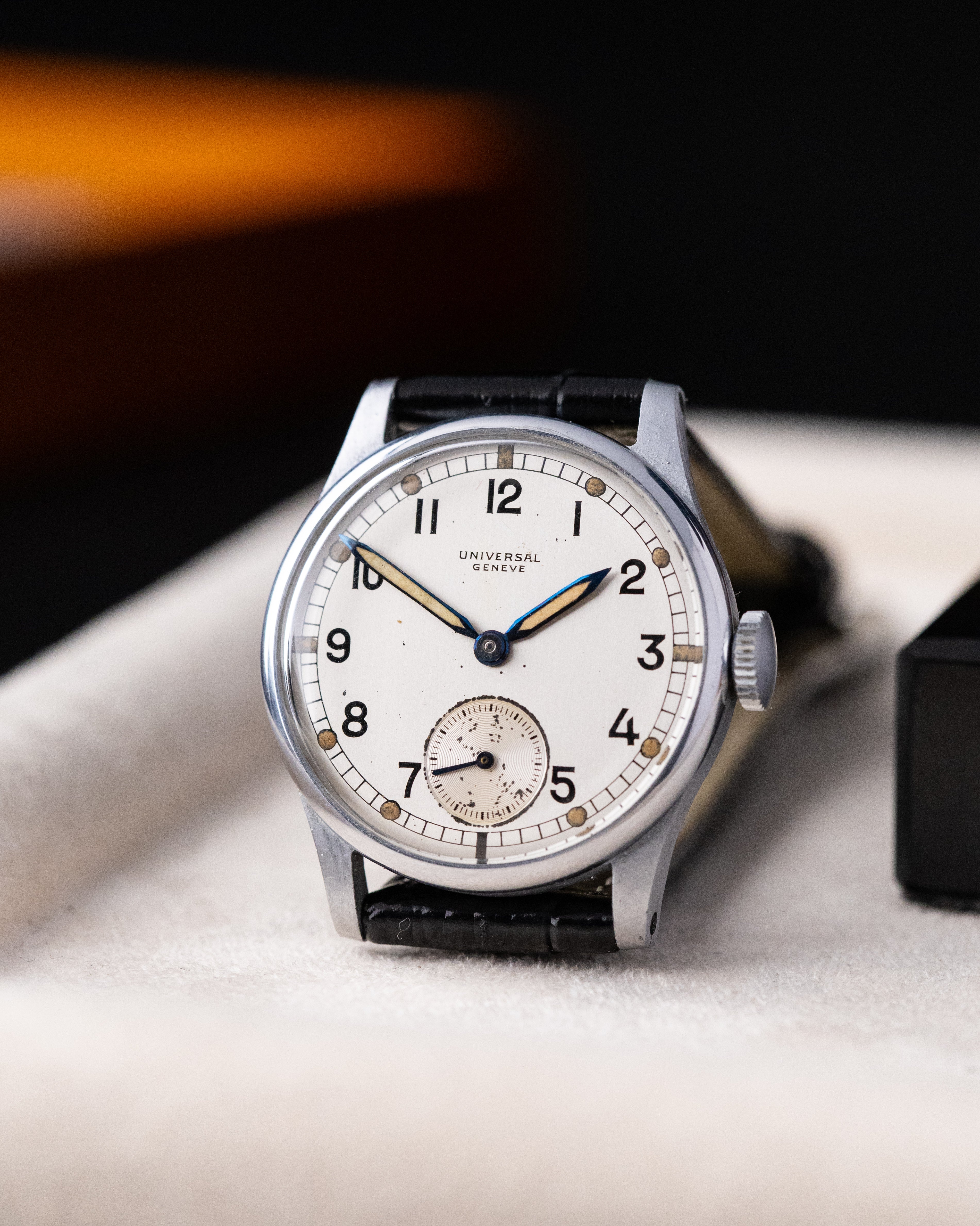 The Universal Genève Cal. 262 military-style watch was produced during the 1940s, a period when the brand was making robust and highly legible timepieces for both military and civilian use. Built for reliability in demanding conditions, these watches combined compact steel cases, luminous numerals, and simple functionality, all powered by the hand-wound Cal. 262.