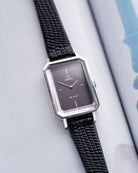 - Originales, anthrazitfarbenes, gebürstetes Zifferblatt mit minimalistischen Stundenmarkierungen