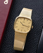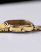This vintage Omega De Ville is a stunning example of minimalist 80s design, pairing a square gold-plated case with a matching original mesh bracelet for a seamless, jewelry-like presence on the wrist. Powered by the ultra-slim manual-wind Caliber 625, this De Ville is the kind of watch that speaks softly but leaves a strong impression.