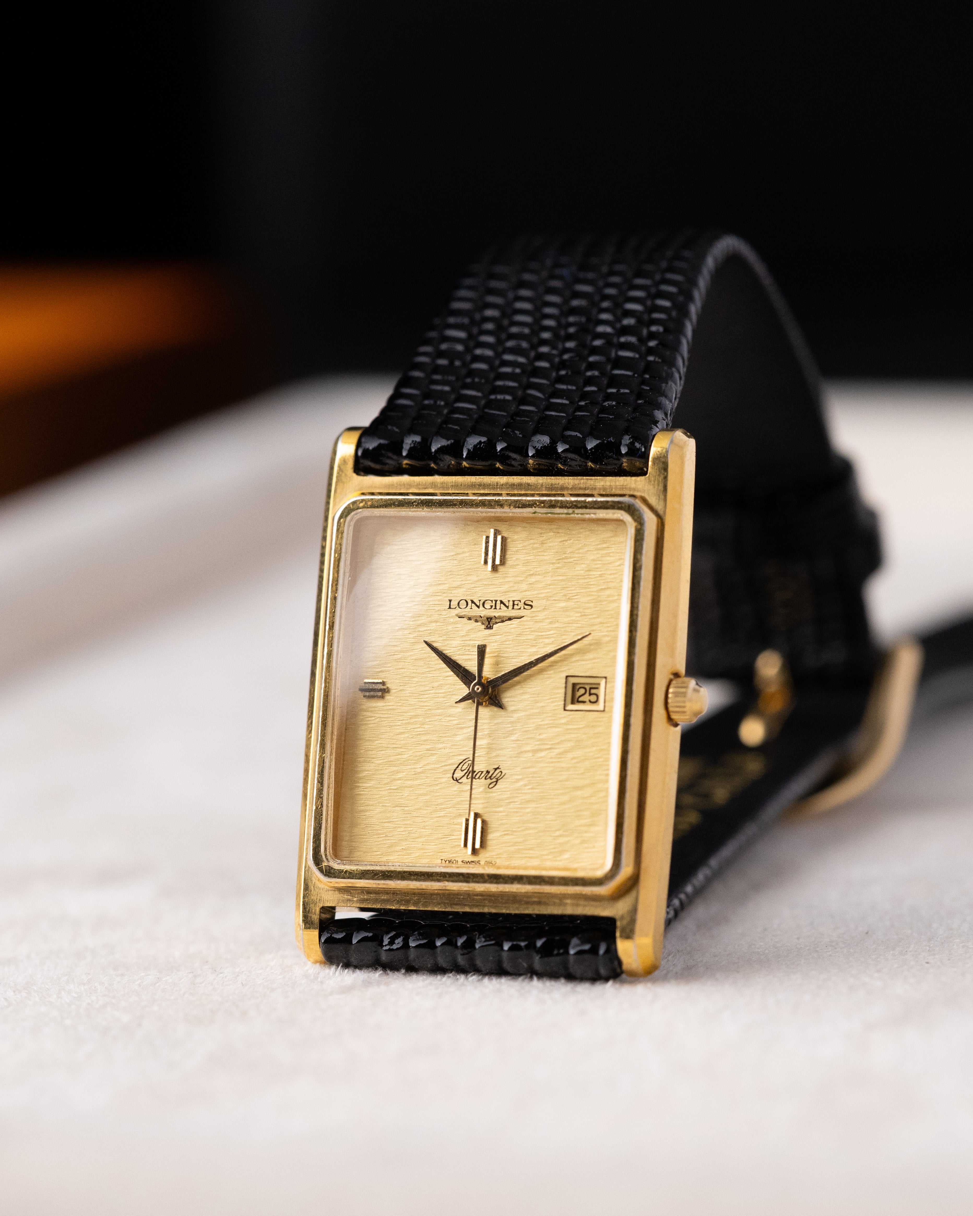 Subtle “Quartz” script at 6 o’clock and framed date window at 3 o’clock