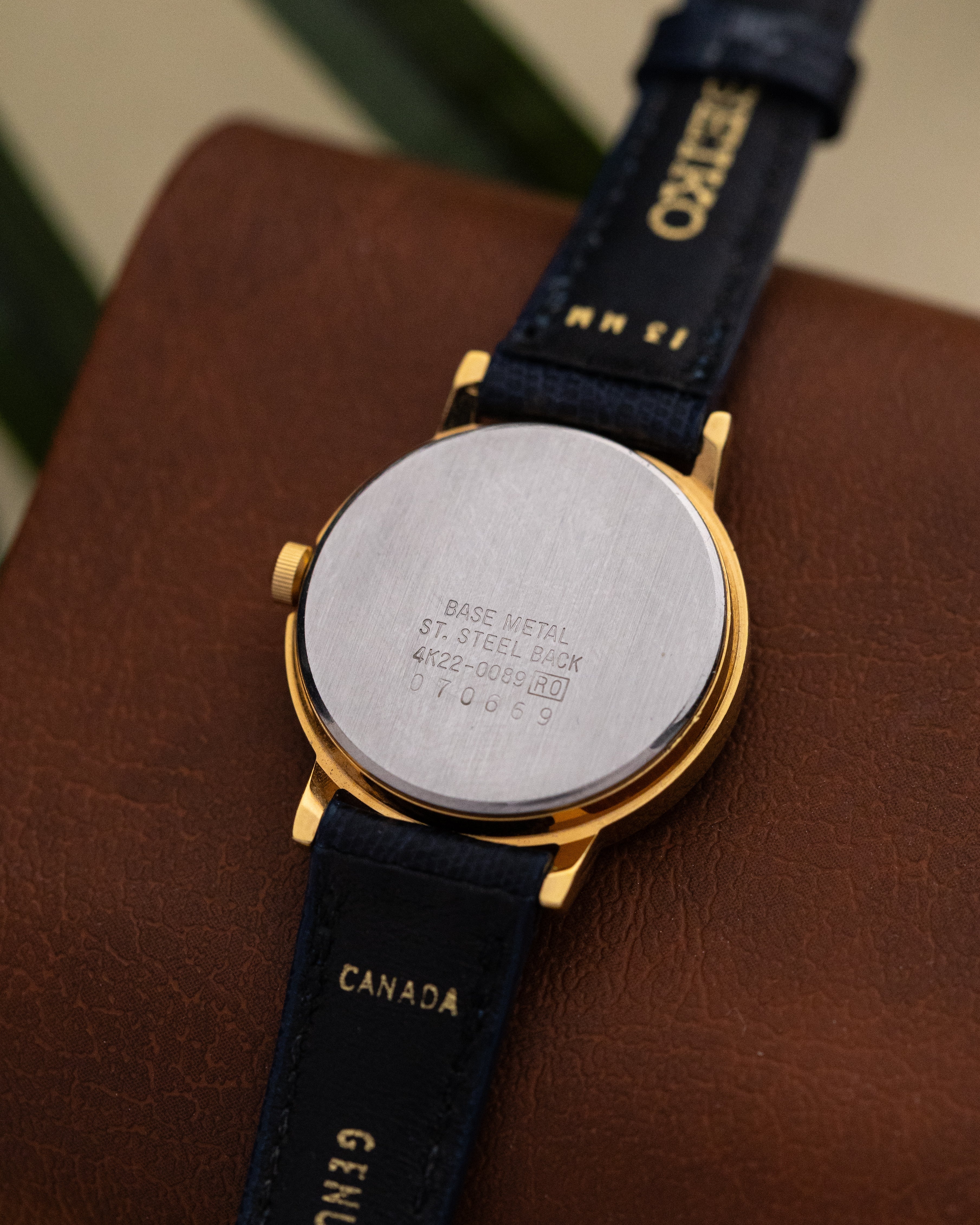 A ladies dress watch from the late 1980s, it was produced at a time when Seiko was pushing the boundaries of what a quartz watch could be - adding poetic complications like the moonphase to compact, elegantly styled cases. Today, pieces like this are quietly sought after by collectors who appreciate Japanese watchmaking with character.