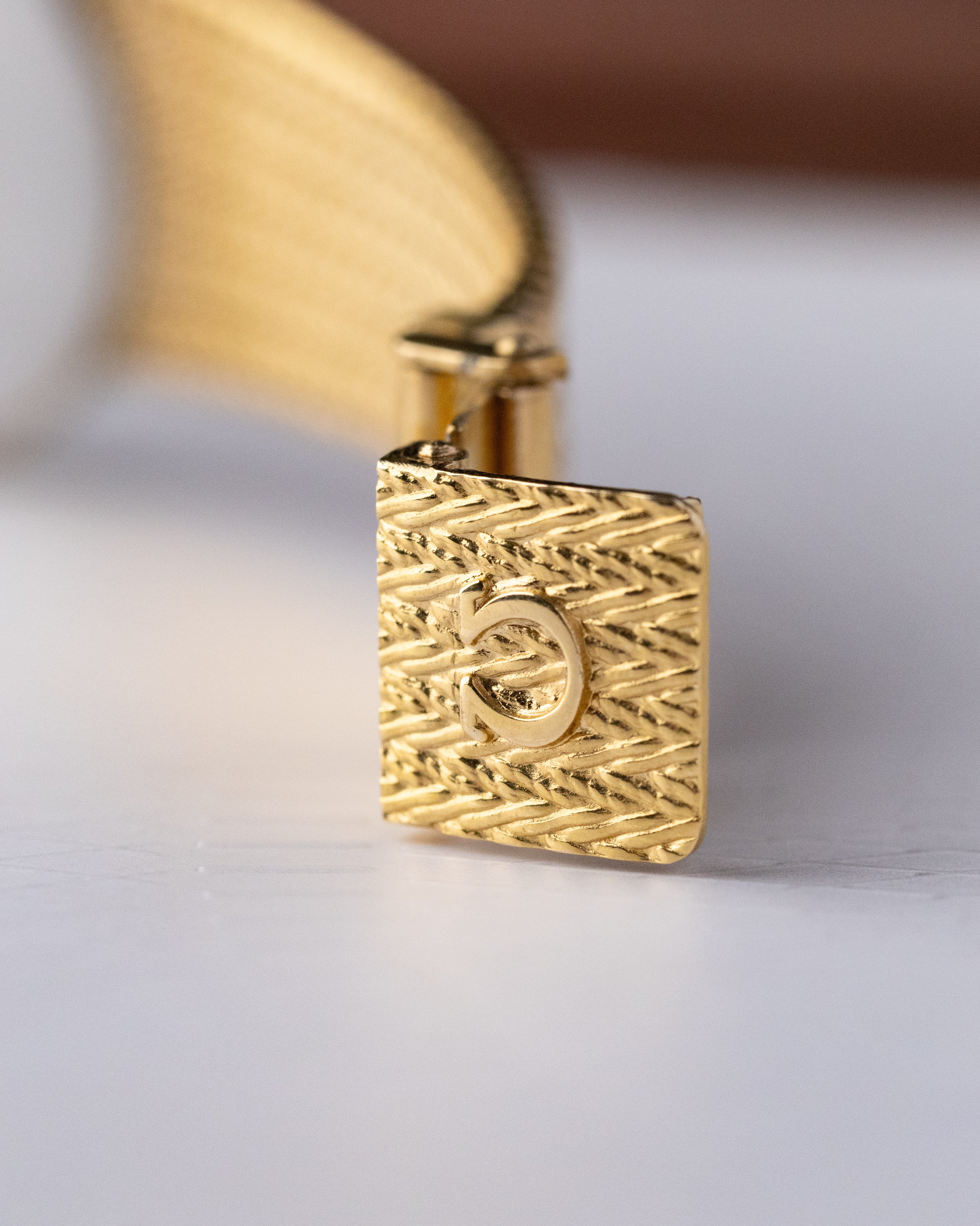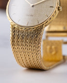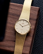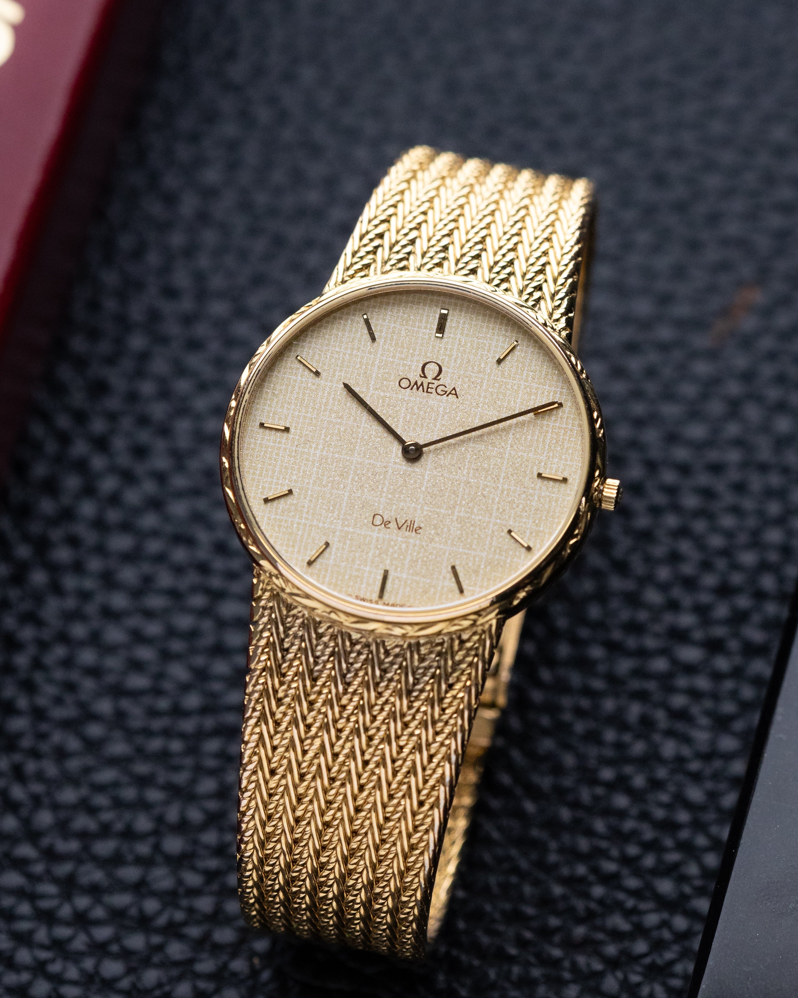 This Omega De Ville is a striking example of refined 1980s elegance, powered by the ultra-slim and reliable Quartz Caliber 1377. Housed in a 32 mm gold-plated case and paired with its original integrated woven bracelet, this watch wears like a piece of jewelry — sleek, sophisticated, and distinctly Omega.