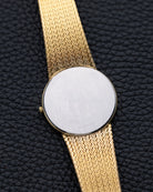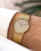 The dial is the true highlight here: a champagne-toned surface with a fine crosshatched texture, beautifully preserved and framed by minimalist gold baton hour markers. In mint condition, the dial shimmers subtly in the light, giving the watch an elevated, formal character without ever feeling loud.