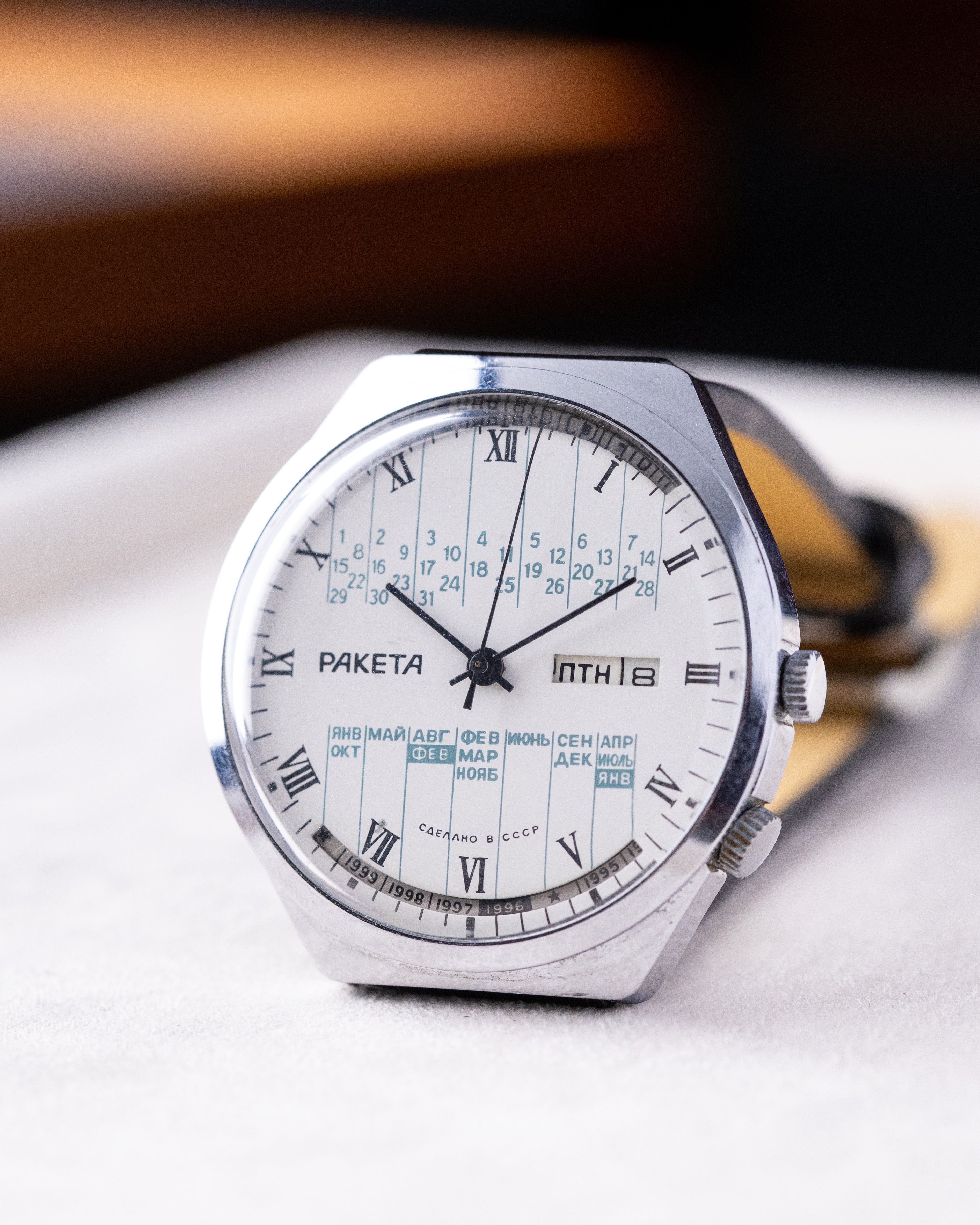 The vintage soviet watch Raketa Perpetual Calendar is one of the most fascinating mechanical watches to come out of the Soviet Union. Designed for practicality and longevity, this vintage timepiece showcases Soviet ingenuity at its best, combining a robust 39mm steel case with a uniquely functional dial "A Calendar That Never Forgets"